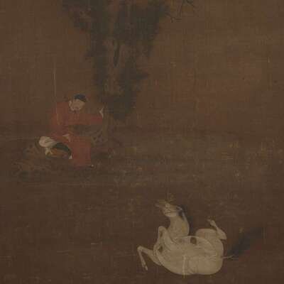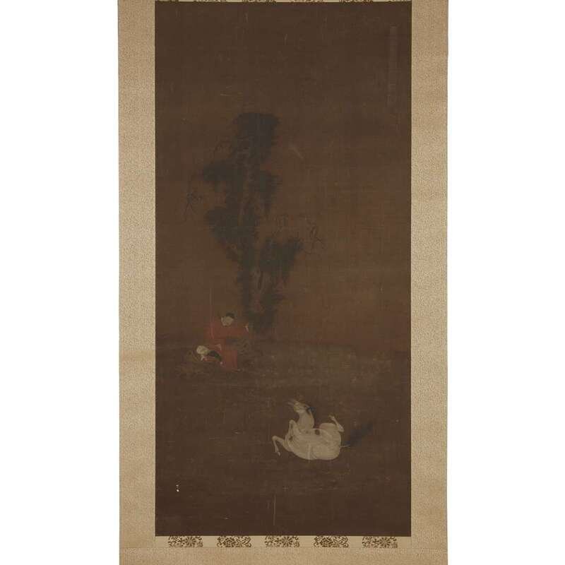 ADMIRING THE WHITE HORSE Ink and color on silk, mounted as a hanging scroll. NOTE: The present work is notable for the elegancy of line and delicacy of coloring. For a discussion of the importance of the horse in the early Ming court, and the artists who depicted them, see Richard M. Barnhart et al, "Painters of the Great Ming, The Imperial Court and the Zhe School", Hong Kong, 1993, pp.119-123. It is interesting to note a vertical patch to the upper right, suggesting a signature had been removed, perhaps to allow an attribution to an earlier Song or Yuan artist, a fate apparently common to many Ming works, as noted ibid, p. 5.