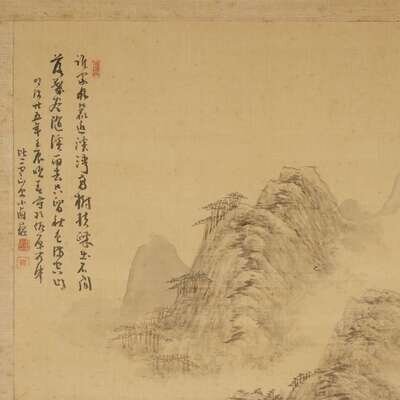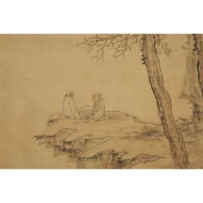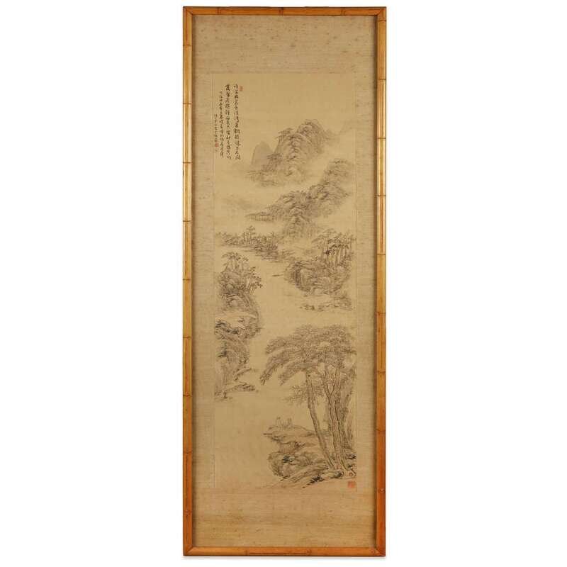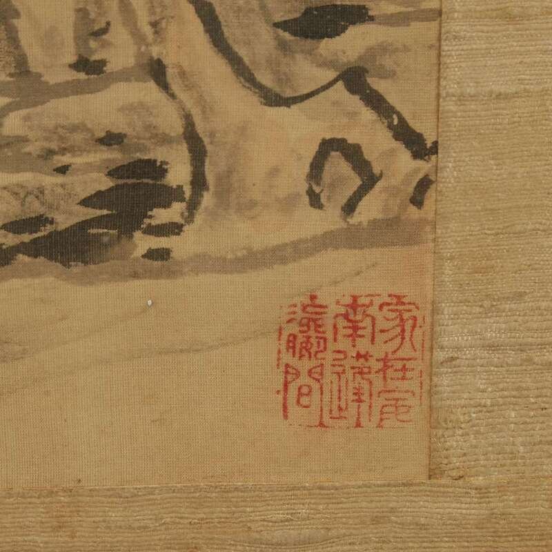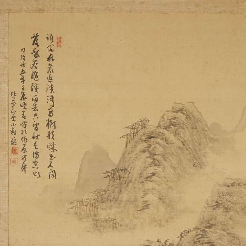 TWO SCHOLARS VIEWING AN EXTENSIVE MOUNTAIN LANDSCAPE Ink on silk, inscribed at top left and with another lower right to bottom right. Mounted on brocade, laid on masonite, framed and glazed.