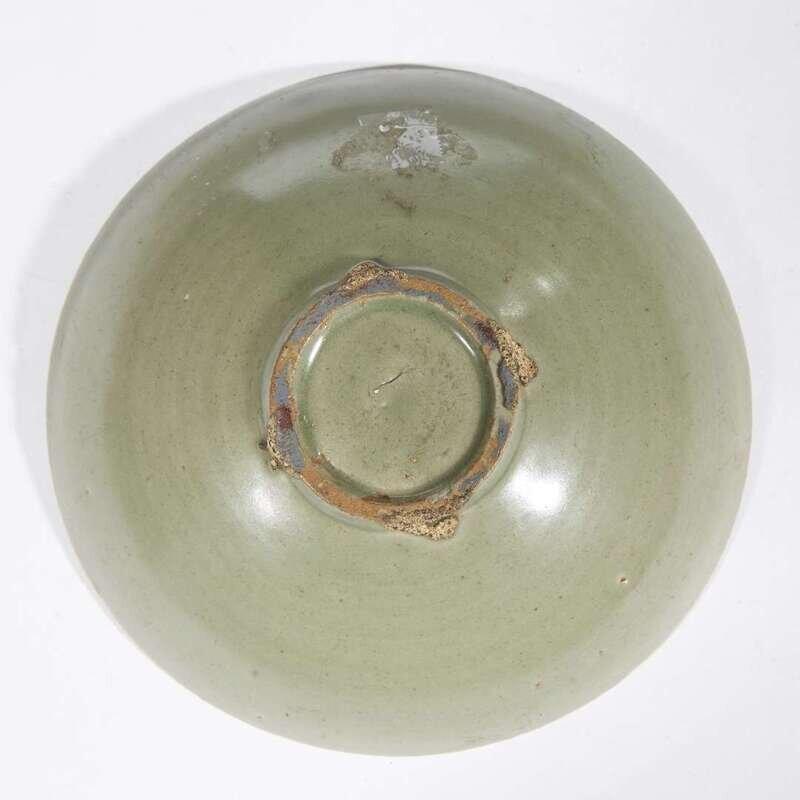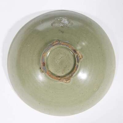 The circular shallow bowl evenly glazed a deep olive-green, unglazed foot rim.