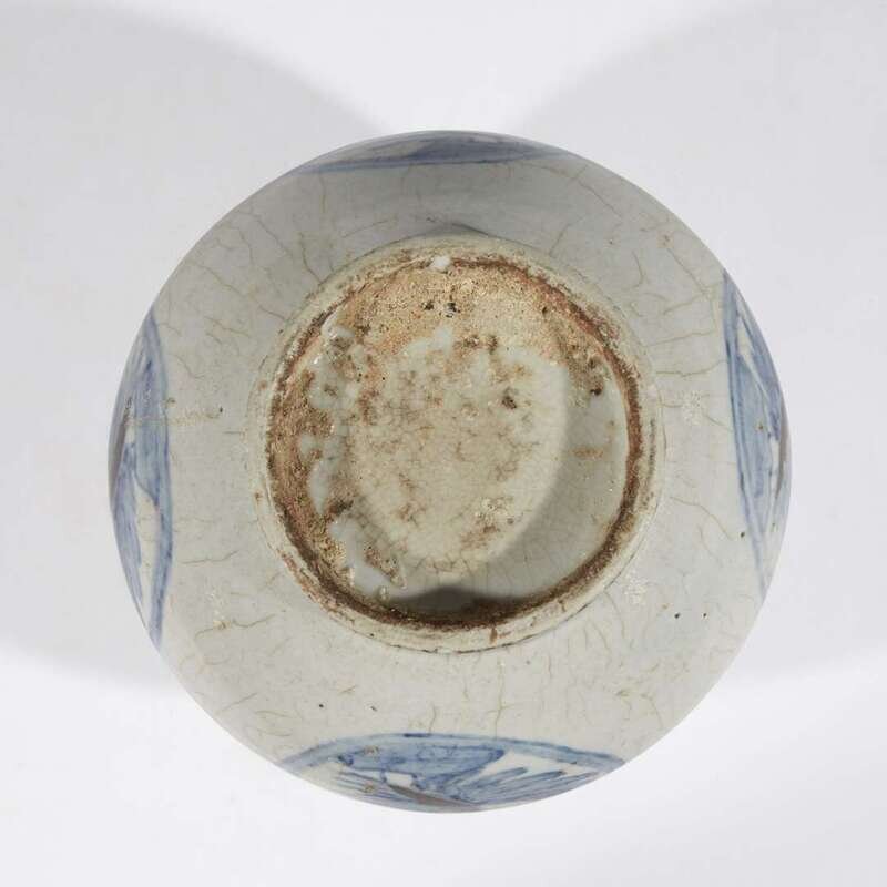 The globular jar on raised circular ring foot and with slightly everted collar, decorated with four cranes roundals, ruyi-scrolls at the shoulder.