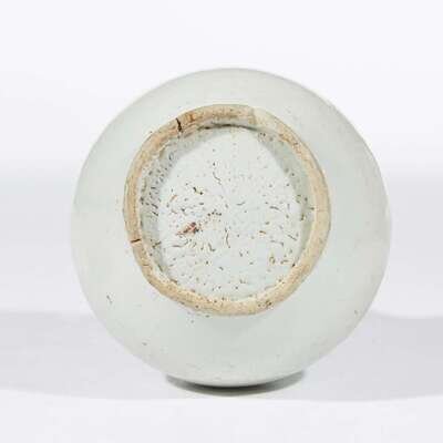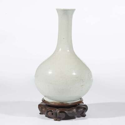 Of well-formed pear shape with a full globular body, flared lip and circular foot ring, all covered in a translucent glaze with slight blue tint, except for the foot rim, later wood stand.