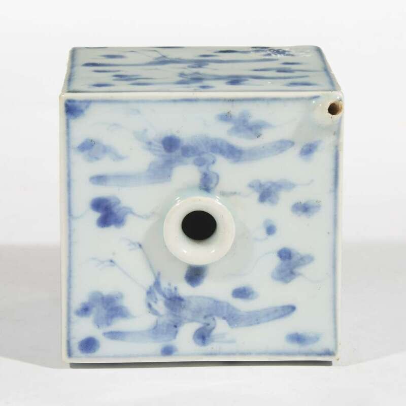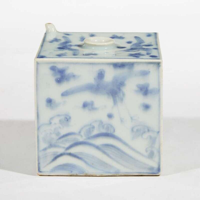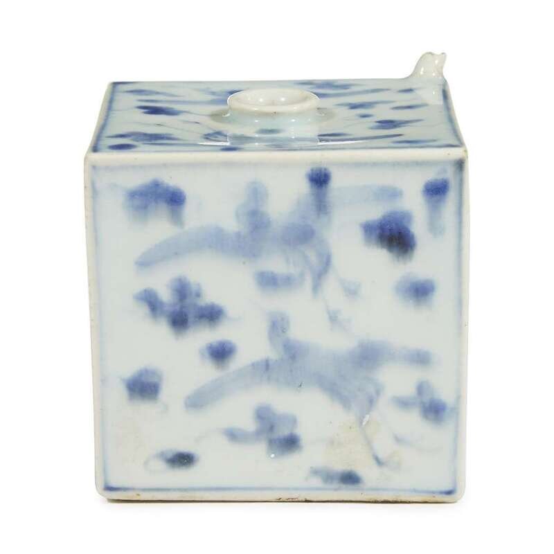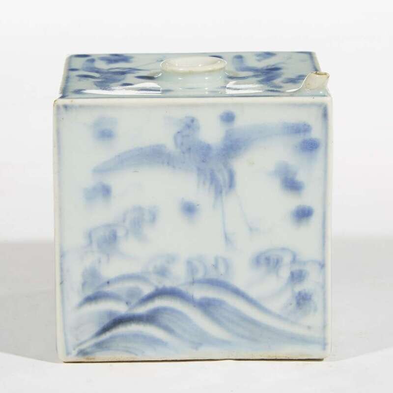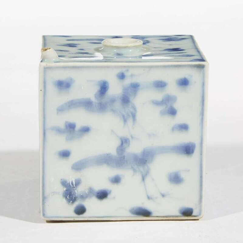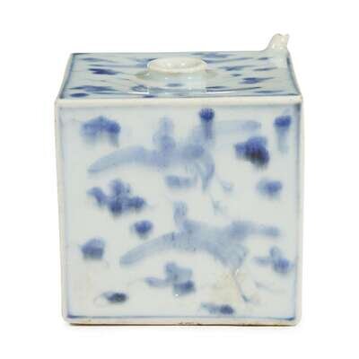 Of square form, two sides painted to depict a flying crane above wave pattern, the other three depicting two cranes amongst clouds, the base unglazed, having a lipped central mouth and a tiny spout to one corner.