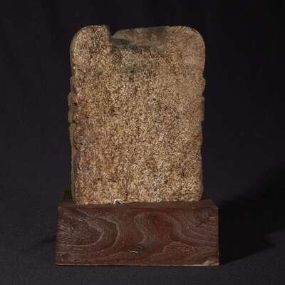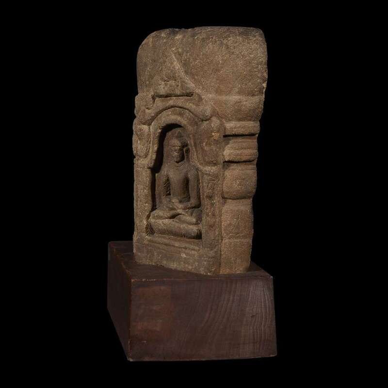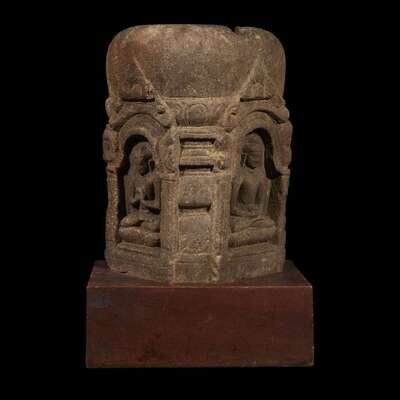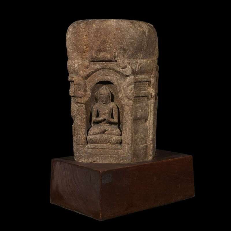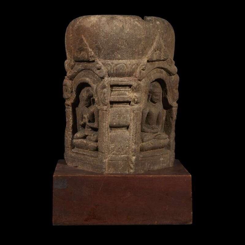 Comprising two sides of a four-sided stupa, with two arched alcoves, each with a Buddha seated in padmasana, one with hands in dhyana mudra, bearing an alms bowl, the other with hands in dharmachakra mudra, seated on a lotus base, below a rounded superstructure, of a granular buff and grey stone, later wood plinth. NOTE: The treatment of the niches and lotus bases of the Buddhas suggest a connection with the sculptural style emanating from the Mahabodhi temple complex in Bodhgaya, Bihar, India. Compare the votive model of the Mahabodhi temple from Bodhgaya, dated to the 9th-10th century, in the collection of the Philadelphia Museum of Art, illustrated in Adriana Proser, et al, "Pilgrimage and Buddhist Art", New Haven, 2010, pp. 152-153, no. 73. See also the more elaborate bronze stupa, attributed to Eastern India, Bangladesh or Himalayan region, 12th century, illustrated in Denise Patry Leidy and Robert A.F. Thurman, "Mandala, The Architecture of Enlightenment", Singapore 1997, p. 55 no. 5.