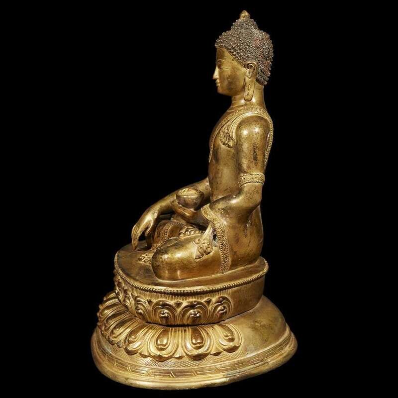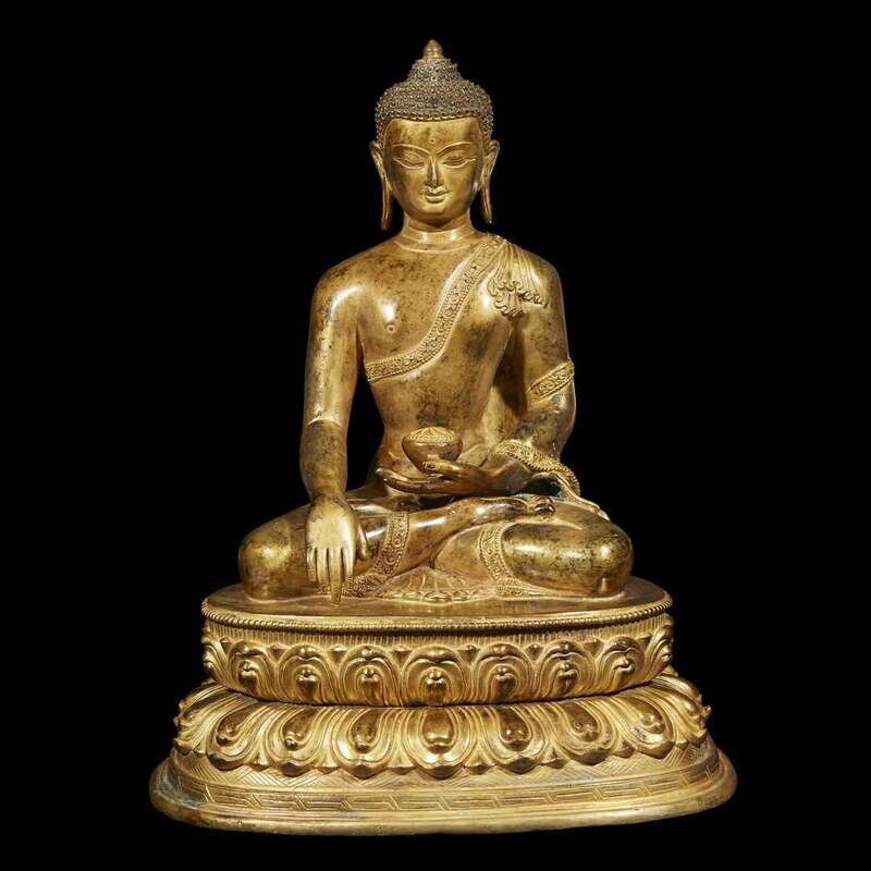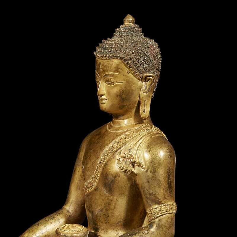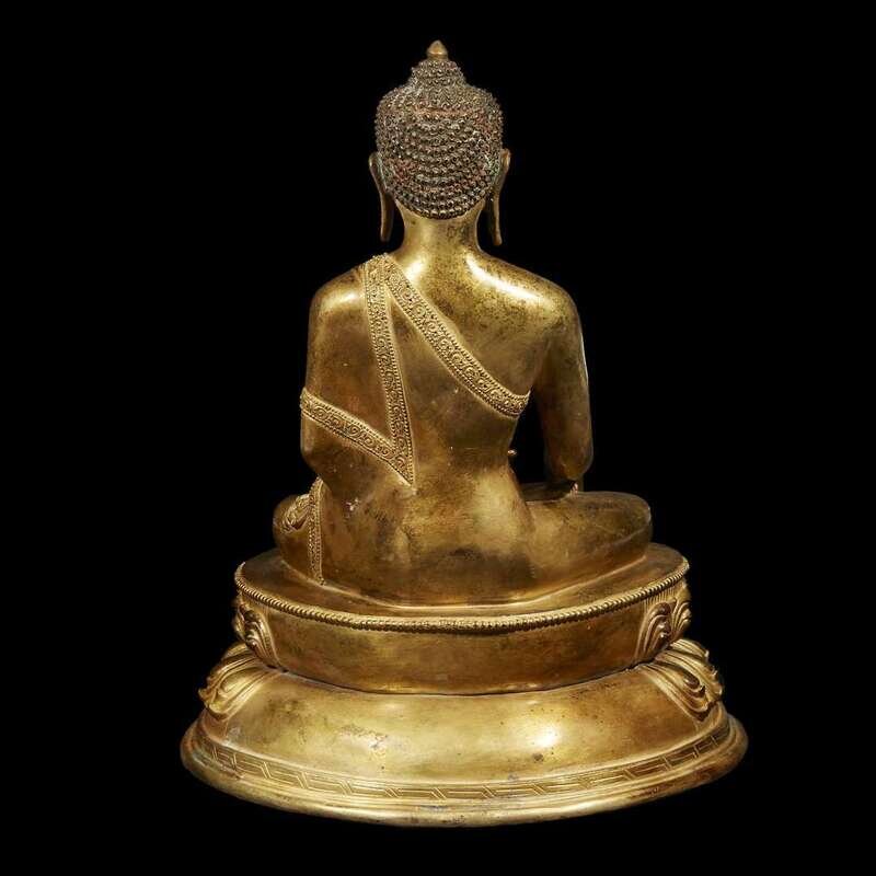 Of commanding scale, depicting either the historical Buddha Shakyamuni, or Akshobhya, Lord of the Eastern Pure Land. The Buddha with a gentle smile and lowered eyes, the urna an incised spiral, the curls on his head and the scrolls on the borders of his robe individualy chased; seated in padmasana, with the right hand in earth-touching mudra, the left bearing a bowl of ambrosial nectar, all upon a double lotus-petal base, further incised with stylized stamens, cross hatching and running fret, the underside with a copper plate incised with a double vajra. NOTE: the present figure is remarkable for the degree of elaboration and intricate handwork to the fine details of the hair, face, draperies and base. The delicacy of modeling and treatment of details appear to relate to much earlier models from the early Malla period, 13th century, such as the nepalese gilt-bronze figure of Buddha Shakyamuni, sold Christie's New York, December 2, 2015, lot 2902. See also the Nepalese head of a Buddha, dated to the 17th century, illustrated in Pratapaditya Pal, "Nepal, where the Gods are Young", Kyoto, 1975, p. 30, no. 7.