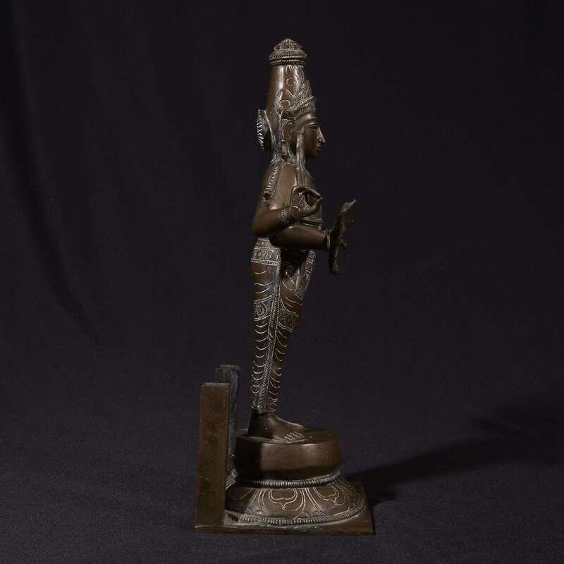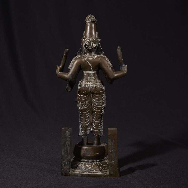The standing crowned figure, holding a sword and trident, two hands in abahya and varada mudra, on a circular plinth with lotus petals above the square base, a pair of standards at the rear to support a mandorla, now lost.
