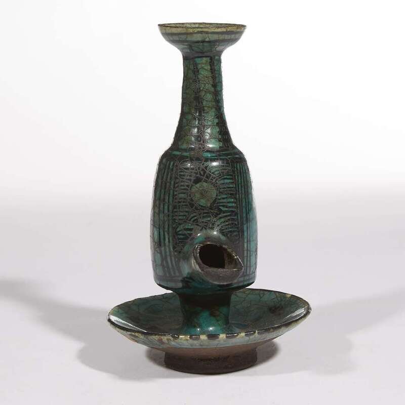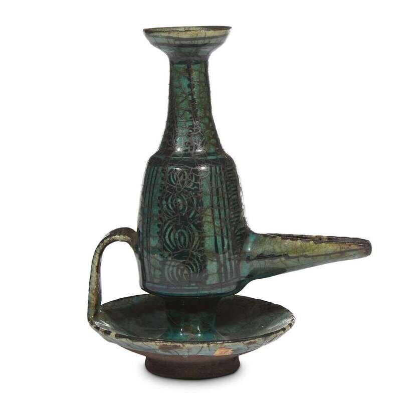 A Persian turquoise-glazed pottery lamp probably 14th century
