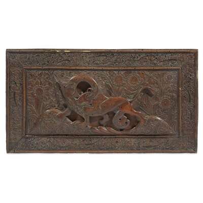 Finely carved, depicting a stylized dragon and lion in mortal combat, against a stylized floral ground, a hillock carved with scrollwork, the border enclosing calligraphic passages among scrollwork.