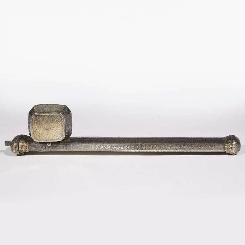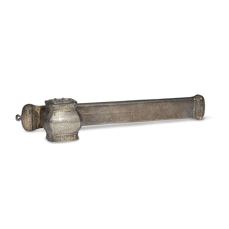 Possibly Egyptian, the slender, slightly tapering pen holder with engraved scrolling design, one side apparently inscribed in Arabic script "Kalawun" and "Sultan, the just...Amir, the Victorious" and "by Muammad", hinged cover, connected to an octagonal ink well with hinged cover, stamped mark with indistinct tugra to underside of well, a second indistinct stamp to side of pen case.
