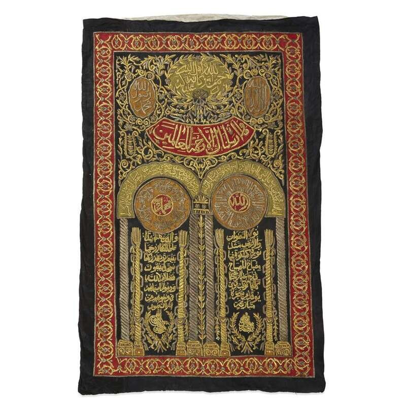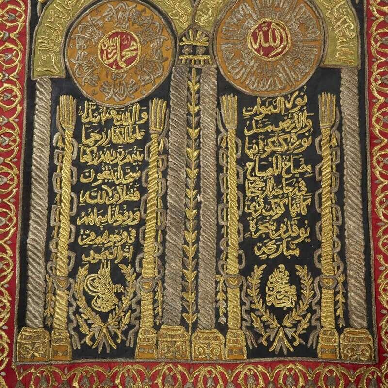 Bearing the tughra of Sultan Mahmud II (r. 1808-1839), dated AH1228. With two arches supported by solomonic columns, enclosing various Arabic inscriptions on the black ground and applied moss-green, golden brown and red panels, below four further applied inscribed cartouches, all within elaborate scrollwork, densely worked in silver and golden metallic threads, within a red-ground border.
