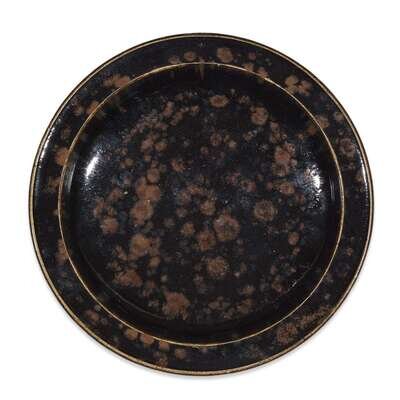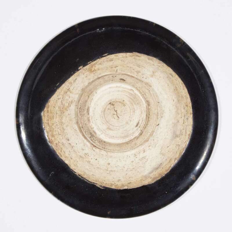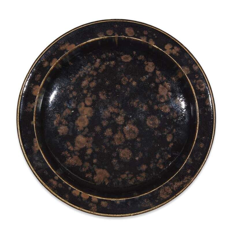 With finely-potted wide rim, the dish supported on a short circular ring foot, thick glossy black glaze with subtle iridescence at the rim, draining from the edges, suffused with irregularly splashed russet to the interior, the glaze stopping in an uneven line around the base and foot, showing the dense, fine-grained buff stoneware body, cloth box. EXHIBITED: Morristown, New Jersey, Morris Museum, "Harmony in Clay: the Elegance and Refinement of Song Ceramics", March 8-June 24, 2012, #86 PUBLISHED: "Song Ceramics, the Eight Kiln Groups at a Glance, Examples from the Jiyuanshanfang Collection, 2008, p. 100.