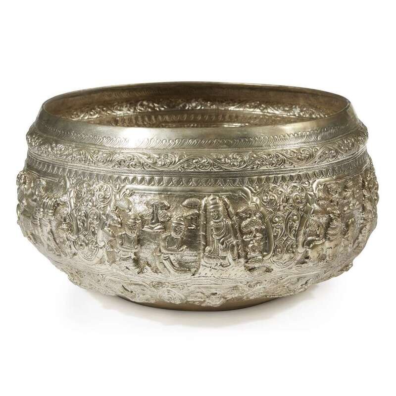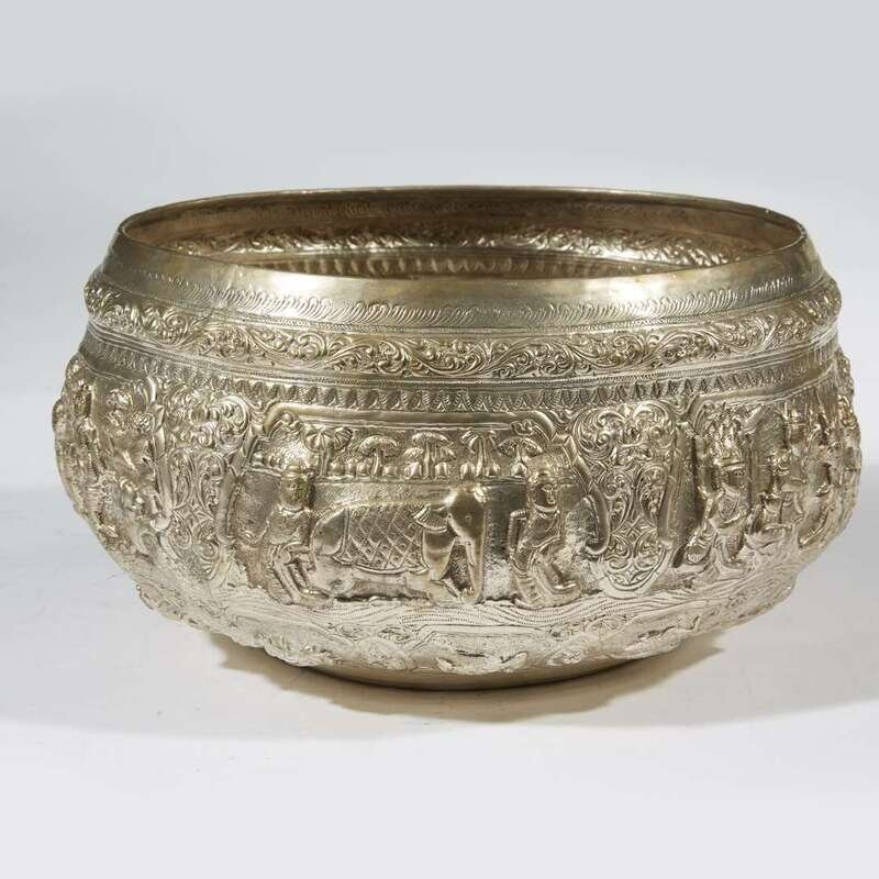 A large Burmese silvered repousse bowl