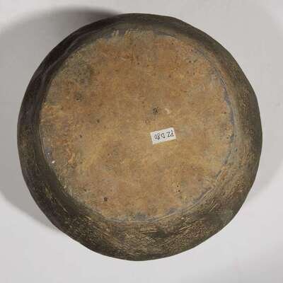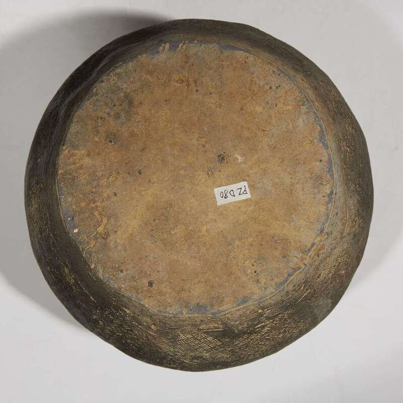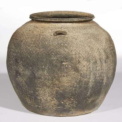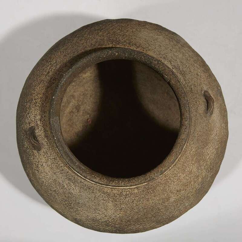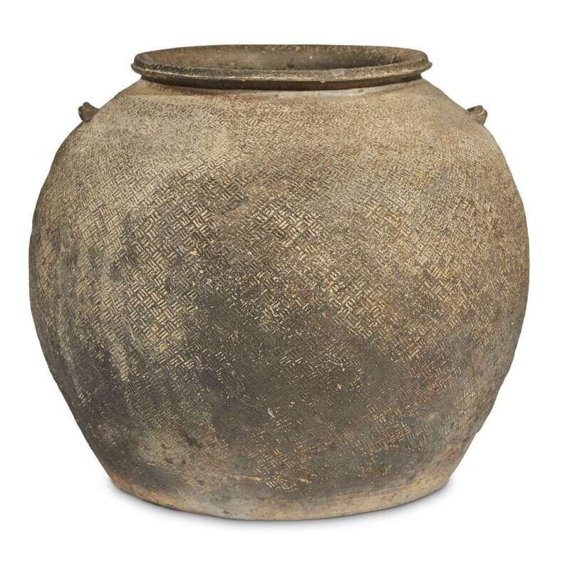 The nearly spherical jar with two small lug handles at the shoulder, the body stamped with an overall grid pattern.