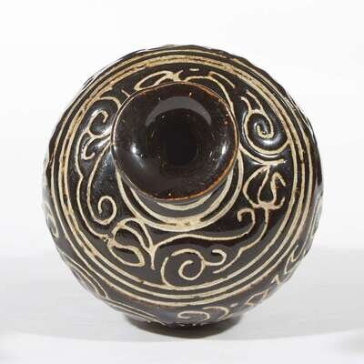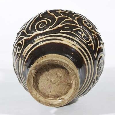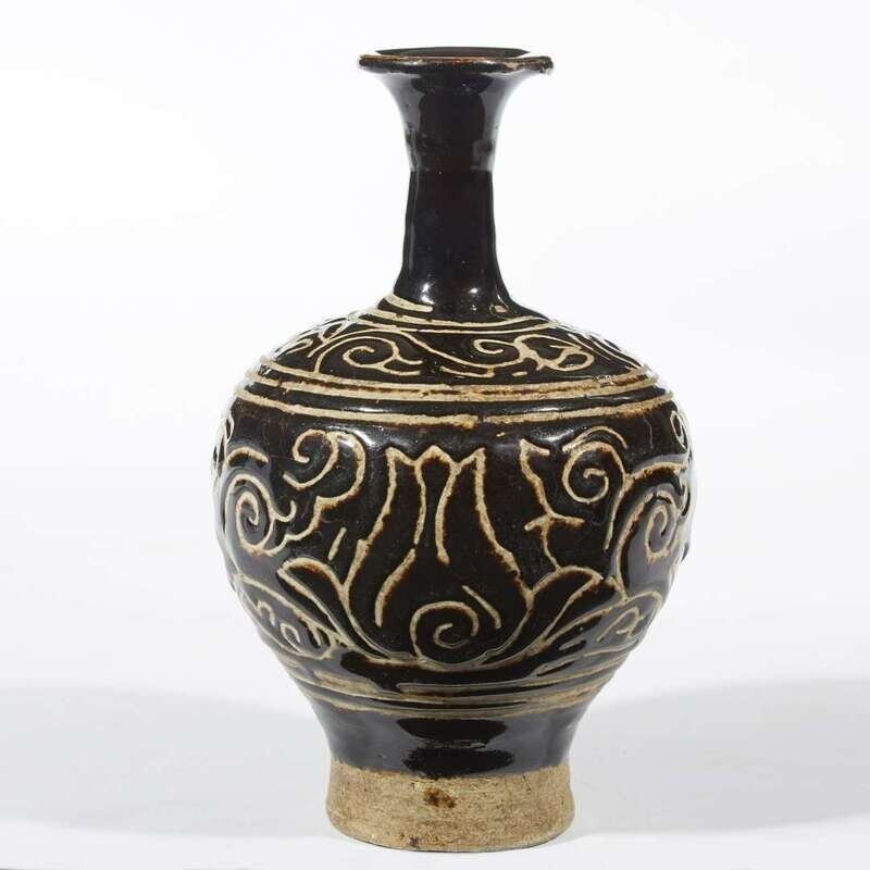 The bulbous body on tapering foot, surmounted by a trumpet neck rising to a flared rim, covered with a lustrous dark brown/black glaze, incised with a broad band of vegetal scrolls at the shoulder and body, the glaze stopping in an irregular line above the foot to expose the buff-grey body.