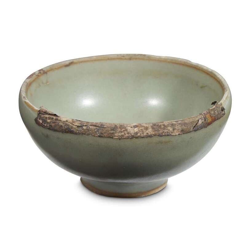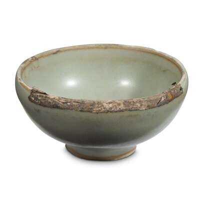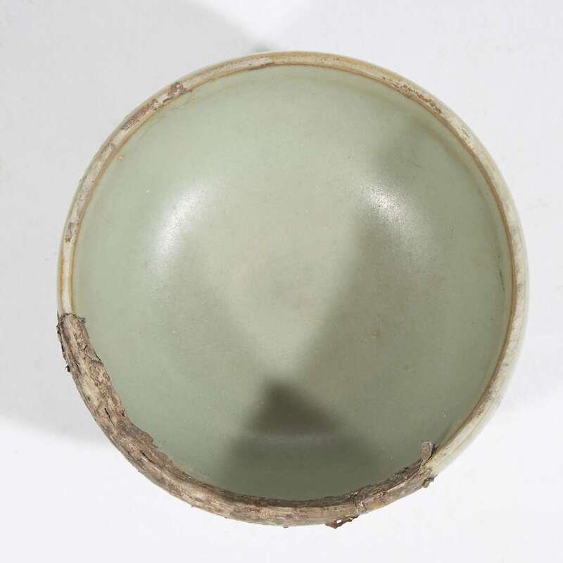 The deep rounded sides rising from a straight foot, covered overall save for the foot ring with a thick even grey-green glaze, remnants of a silver rim, the rim and foot ring unglazed.