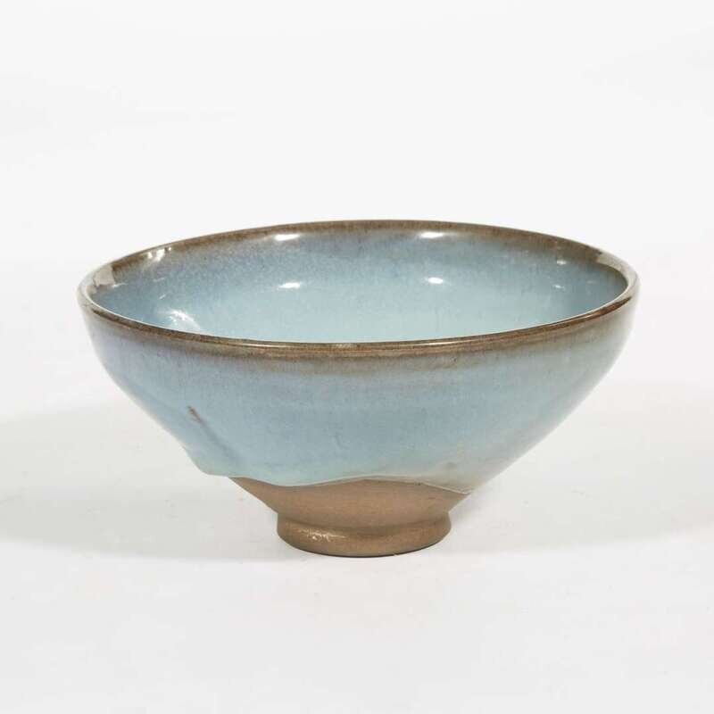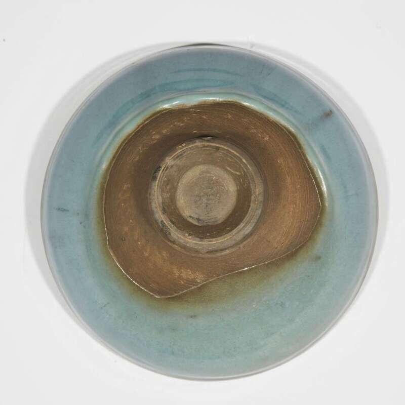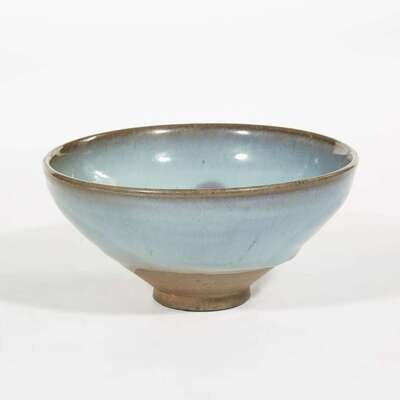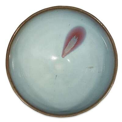 Of deep curving sides rise from an unglazed circular foot. The interior pale blue, draining from the mushroom-brown rim, the interior with a single purple-red splash. the exterior with the viscous glaze stopping in an irregular welt above the grey-brown foot.