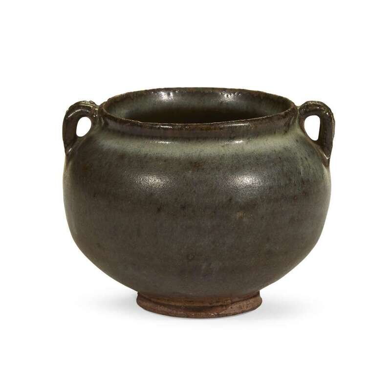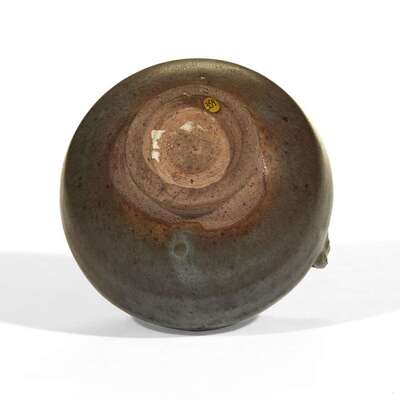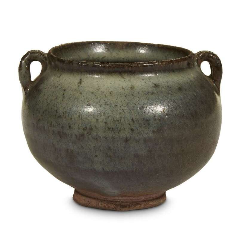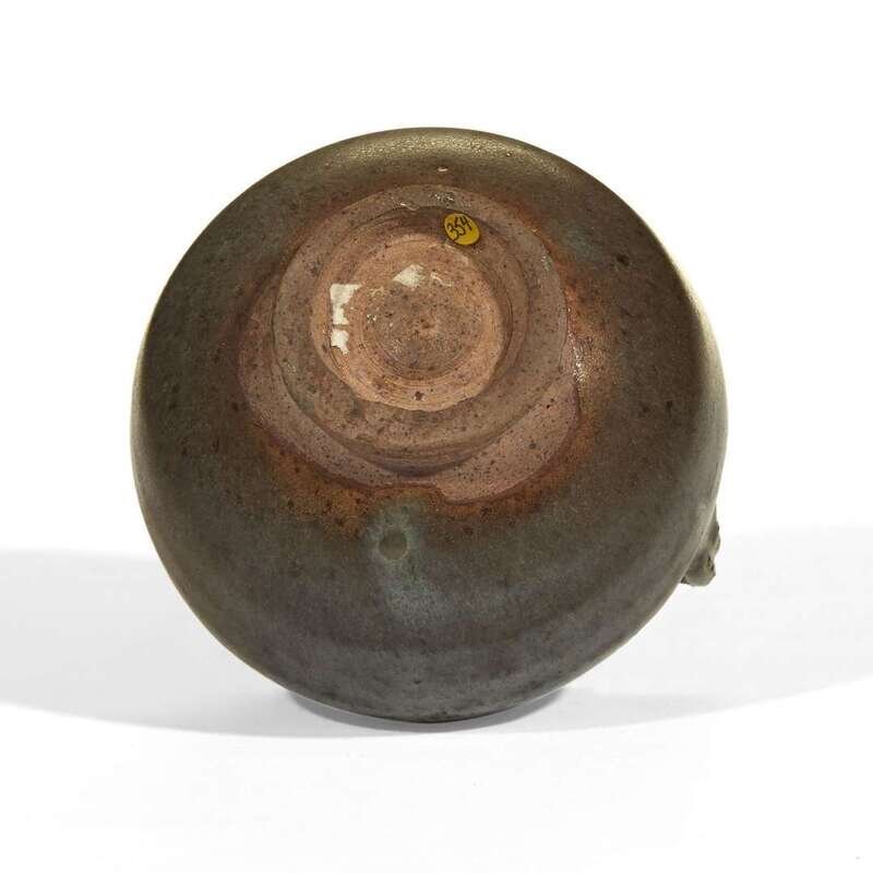 Of compressed globular form with two loop handles at the shoulder, with an unusual dark blue-brown glaze with areas of lighter blue-grey, on tapered circular foot.