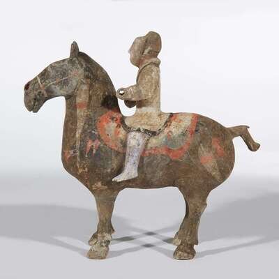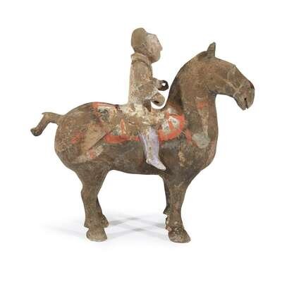 The male groom riding astride a dark horse with well-detailed saddle, standing foursquare, well-modeled with alert ears and flared nostrils. The results of the Chinese University of Hong Kong thermoluminescence test, #M291, dated October 24, 2000, are stated to be consistant with the suggested date of manufacture.