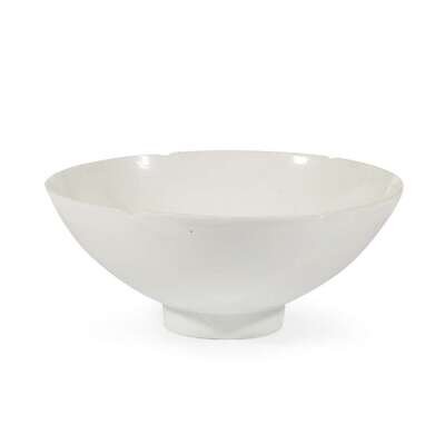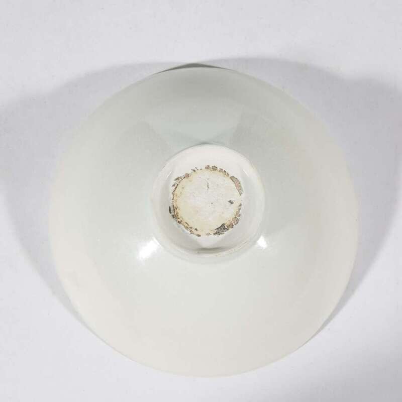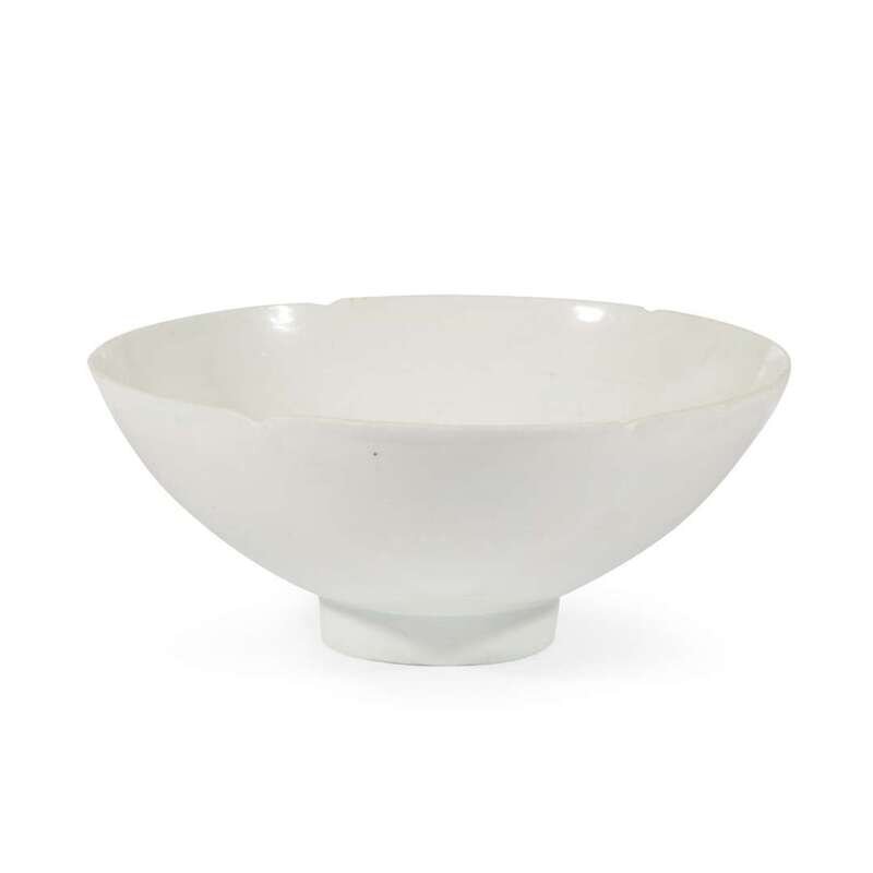 With six-lobed rim, incised with stylized floral motifs, a pale blue-tinted glaze. The circular foot of the bowl is left partially unglazed on the underside, brocade box.