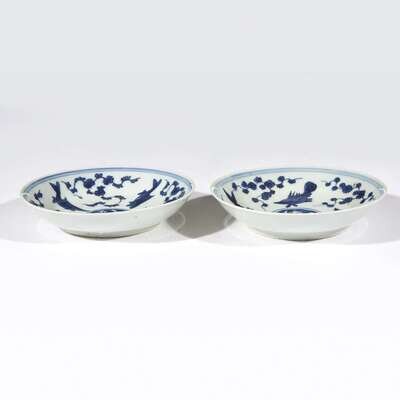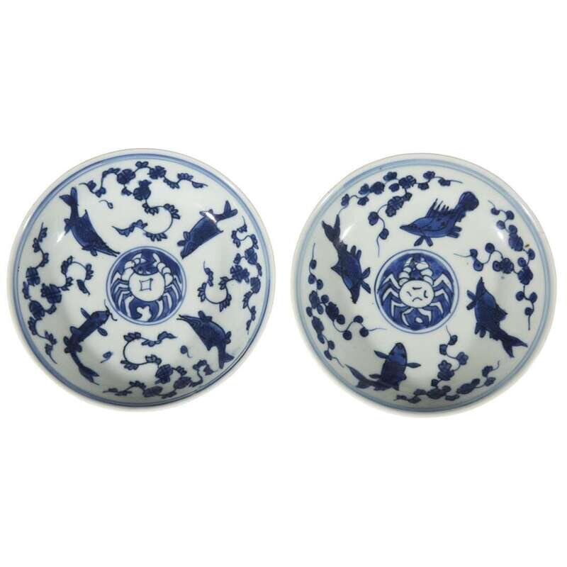 A pair of Chinese small blue and white porcelain "Crab and Fish" dishes Ming dynasty, Jiajing-Wanli period