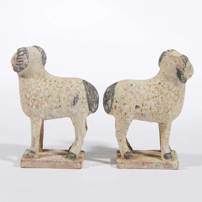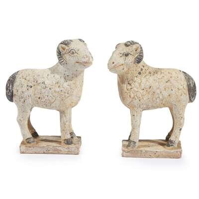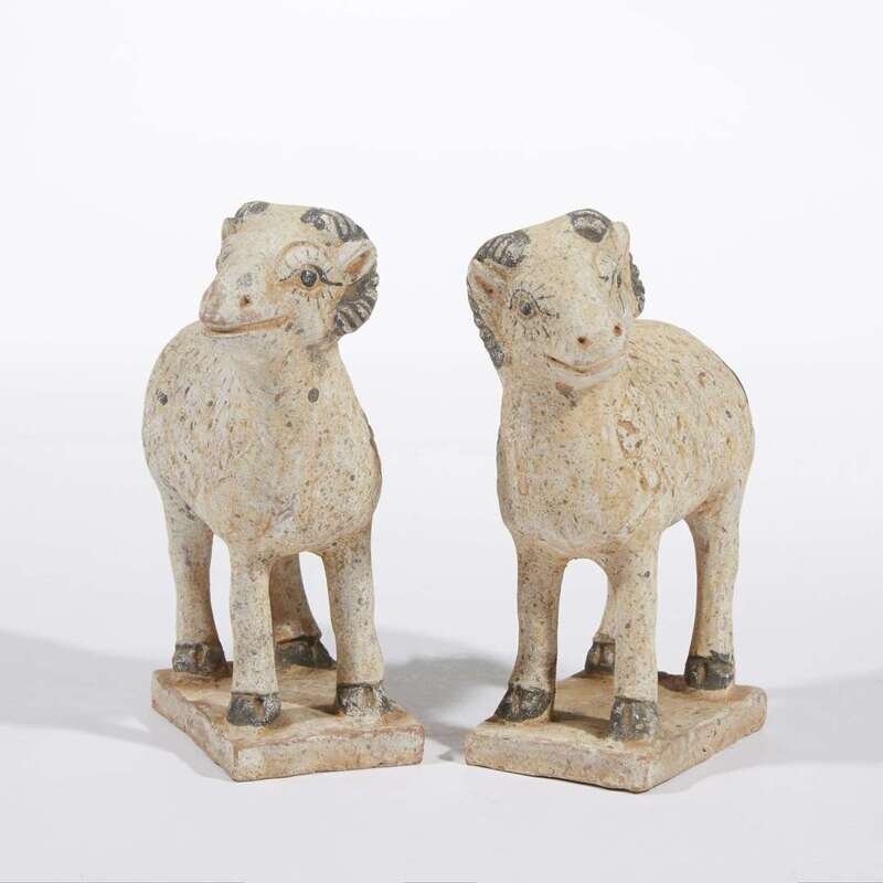 Standing foursquare on a rectangular base, each with curly fleece and curled horns, a charming expression on their faces.