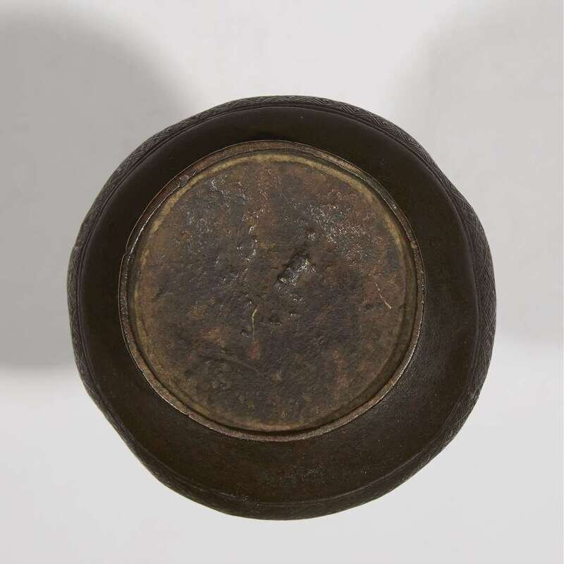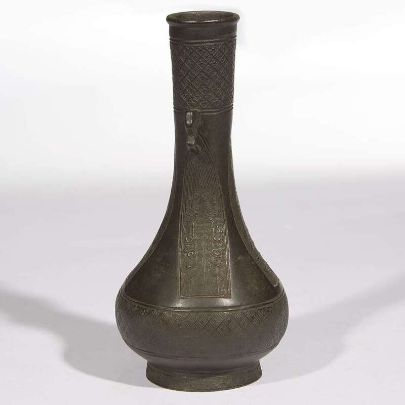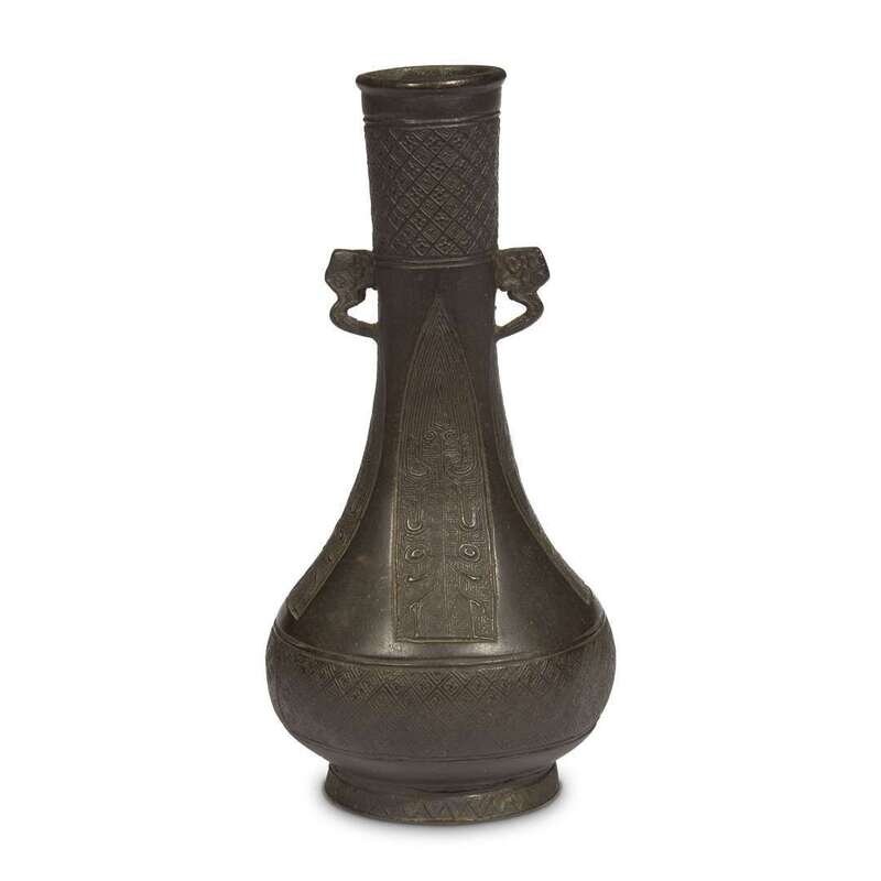 The sides cast with archaistic cicada lappets, the neck and base cast with "Wan" diaper. NOTE: for a hexagonal vase with paneled decoration and similar cloud handles, see Sotheby's Hong Kong, "Later Chinese Bronzes from the Collection of Ulrich Hausmann", October 8, 2014, lot 3392.