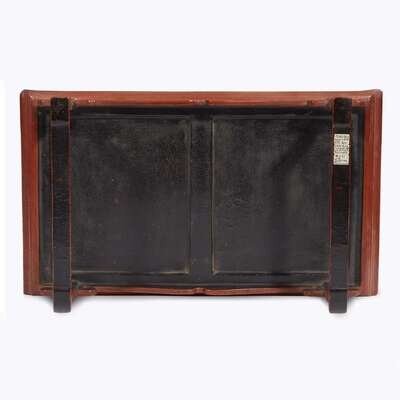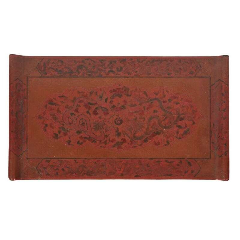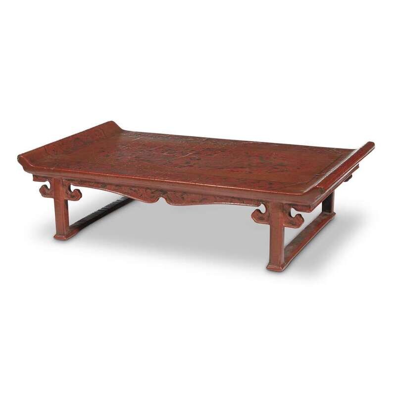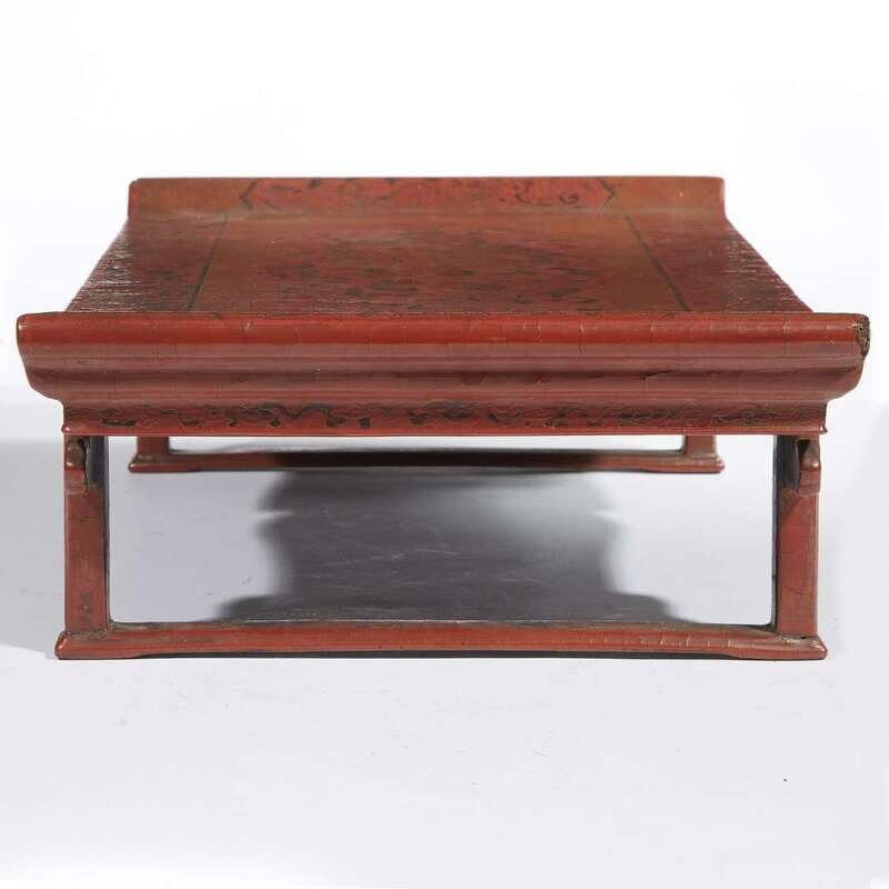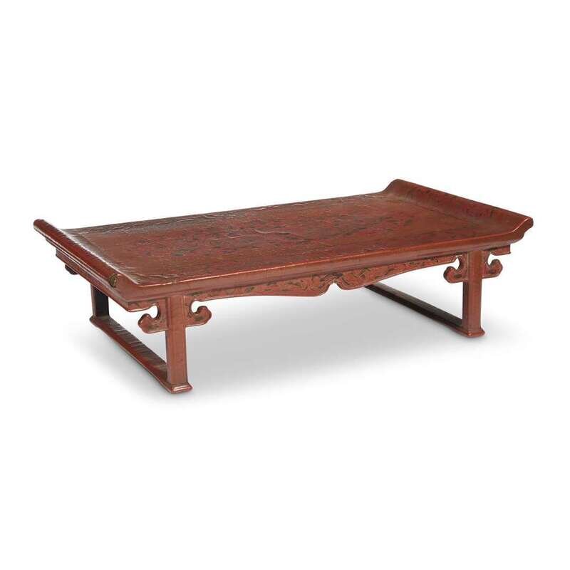 The rectangular top with flared ends, centered by a shaped cartouche, enclosing a pair of sinuous dragons contending a flaming pearl among ruyi-head form flames and clouds, the cartouche against a "cash" diaper ground, the borders with similar shaped cartouches, with six additional dragons among clouds, all in various shades of reds, oranges, and browns, raised on molded straight legs with flanged knees, joined by a scrolled skirt, incised with stylized bats and cloud scrolls, the feet joined by slightly humped horizontal stretchers, the underside lacquered black. NOTE: for a similar, closely related example see the stand sold Christie's London, May 12 2009, lot 85. See also the example illustrated by Fang Jing Pei in "Treasures of the Chinese Scholar", New York, 1997, p. 70, fig. 55.