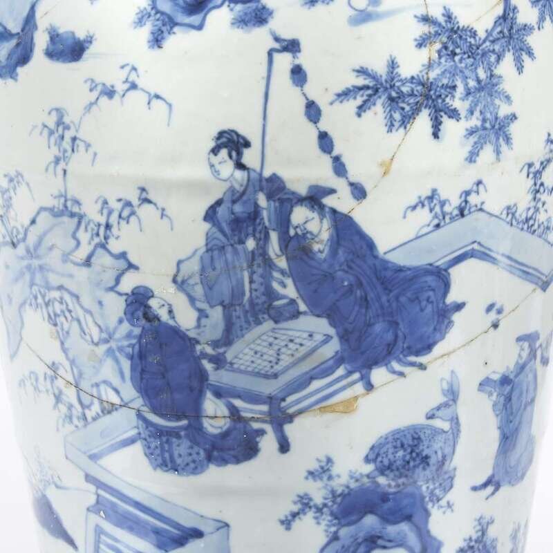 The exterior finely painted with a continuous scene of a mounted warrior approaching a terrace where scholars are playing weiqi, a meiren looking on, a scholar and deer to their right, trees and rockwork, above a register of peonies and rockwork, the shoulder with ruyi lappets and floral scrolls.