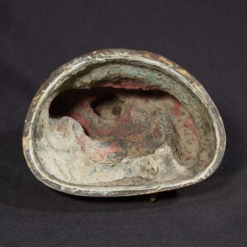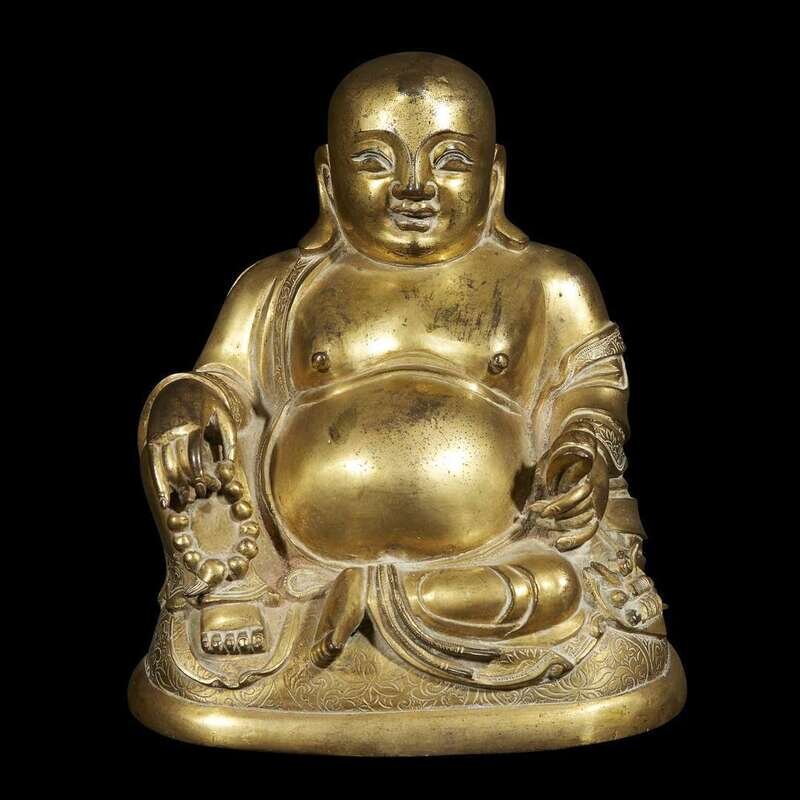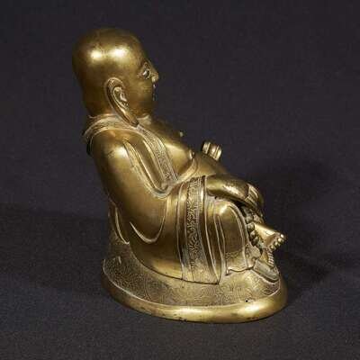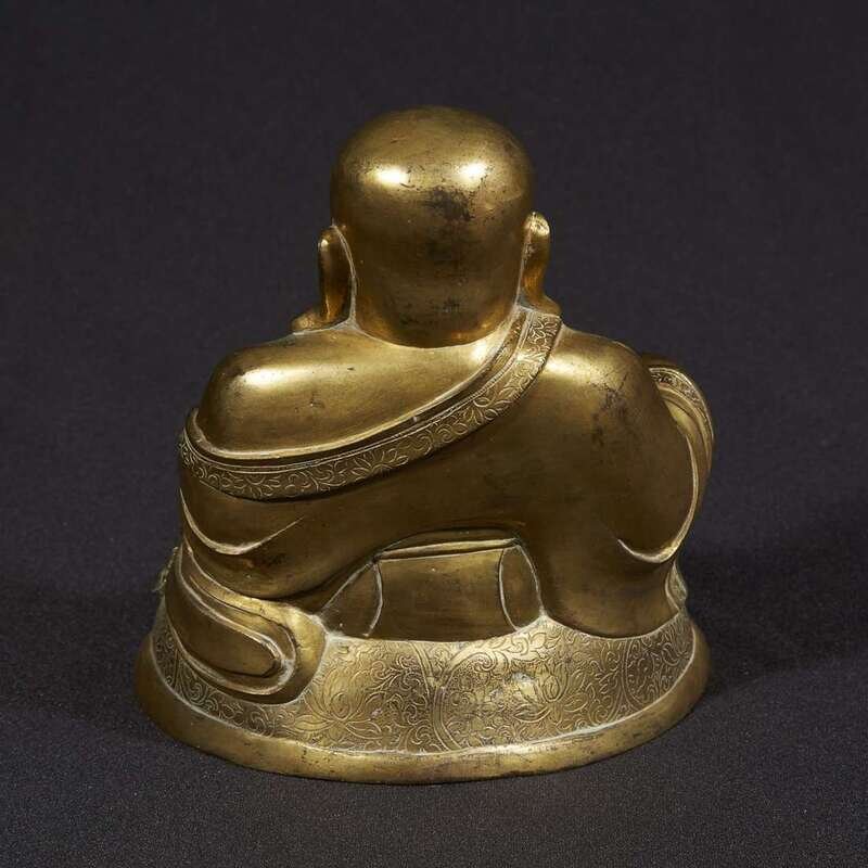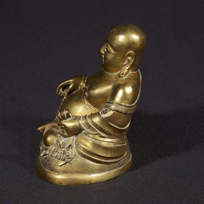 The smiling figure in rajalilasana with a loosely fitted robe with incised floral decoration, holding a string of prayer beads in his right hand while clutching a cloth bag in his left, seated on a "brocade" cushion. NOTE: The jovial Budai with his bag of abundance has been a popular subject for bronze and gilt-bronze sculptors since the Ming dynasty. For a larger example of this type, dated 1428, from the collection of Stephen Junkunc, III, see Christie's New York, September 13-14, 2018, lot 1134. See also the slightly larger two examples in the Chang Foundation, dated to the 16th/17th century, illustrated in "Buddhist Images in Gilt Metal", Taipei 1993, pp 62-64, nos. 24, 25.