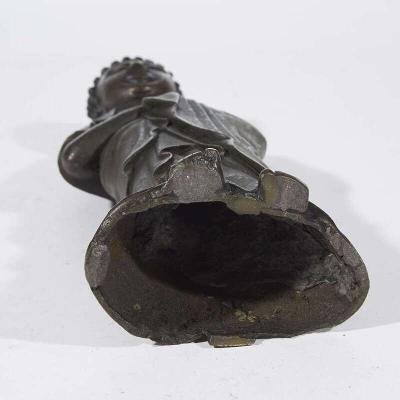 Adorned in a flowing robe, the borders finely-engraved with peony scrolls, dark crusty brown-black patina.
