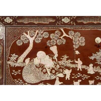 Decorated with Budai under a pine with playing boys in a garden, woven insets to border, Japanese wood box.