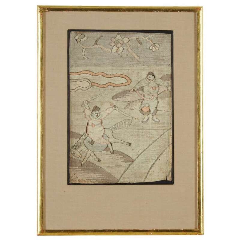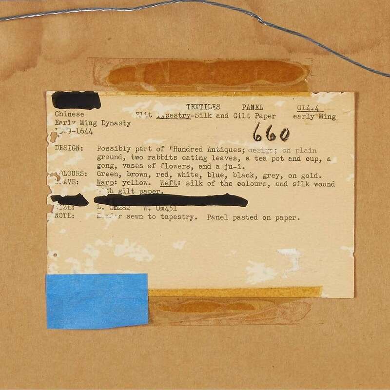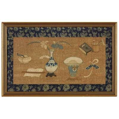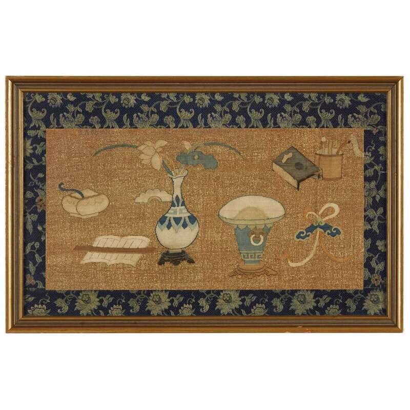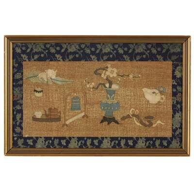 Comprising: a pair depicting antiques and auspicious objects against a gold ground, later silk brocade borders, framed and glazed, one with an old collection card verso; a fragment depicting two figures in a landscape, one mounted, framed, matted and glazed.