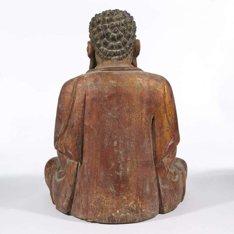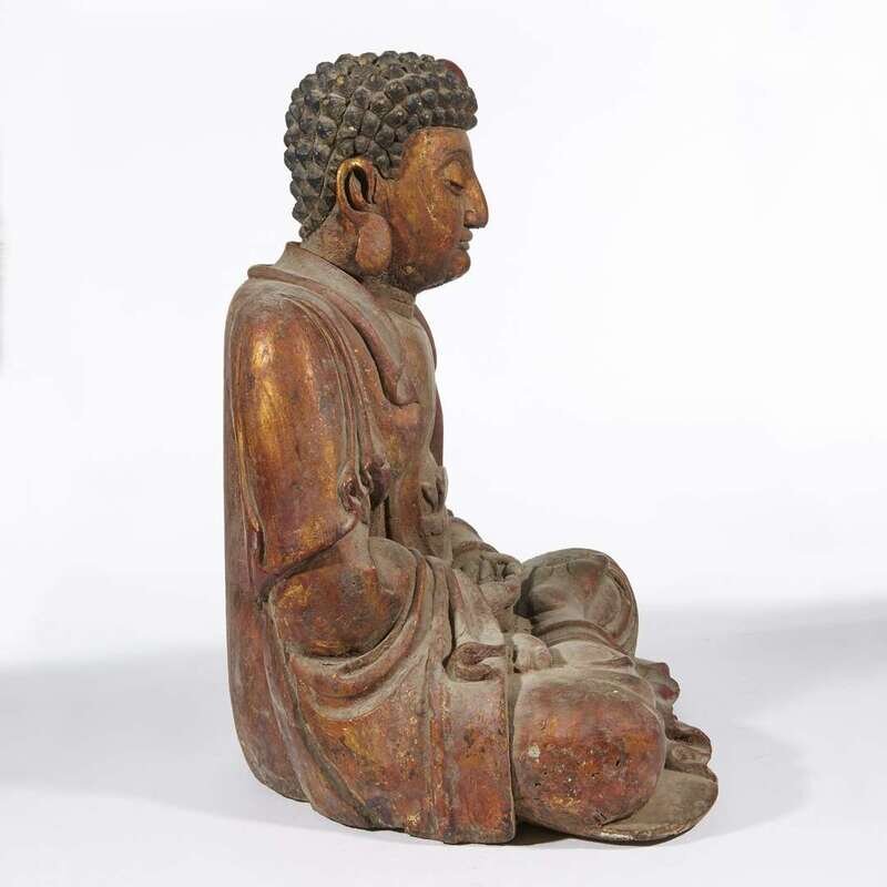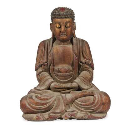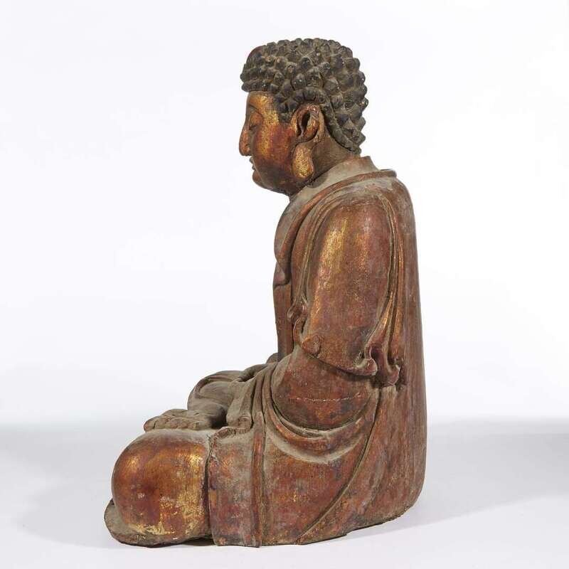 Seated in padmasana, hands in lap, with peaceful face and gracefully draped robes.