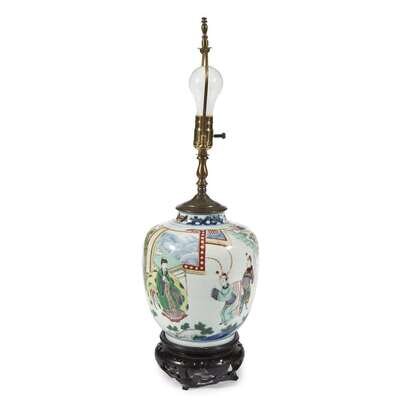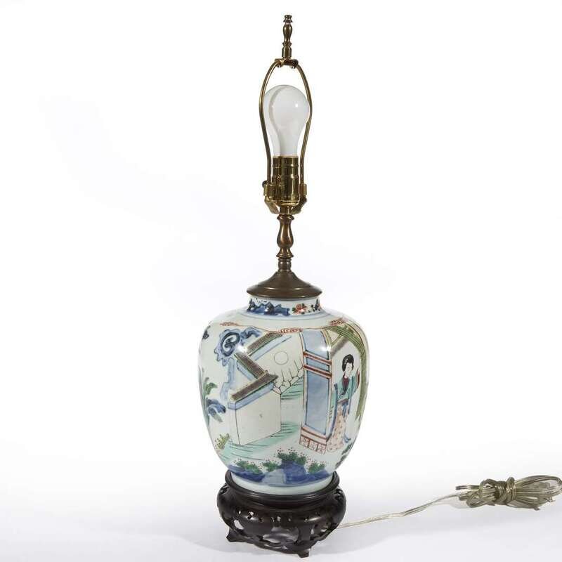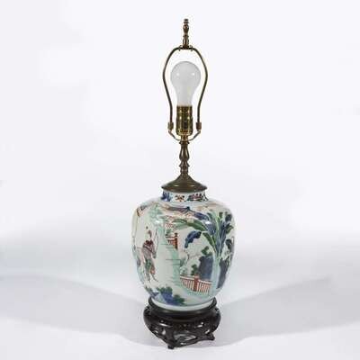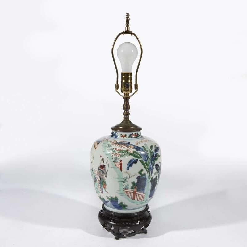 A Chinese wucai-decorated porcelain jar, now mounted as a lamp The jar 17th century