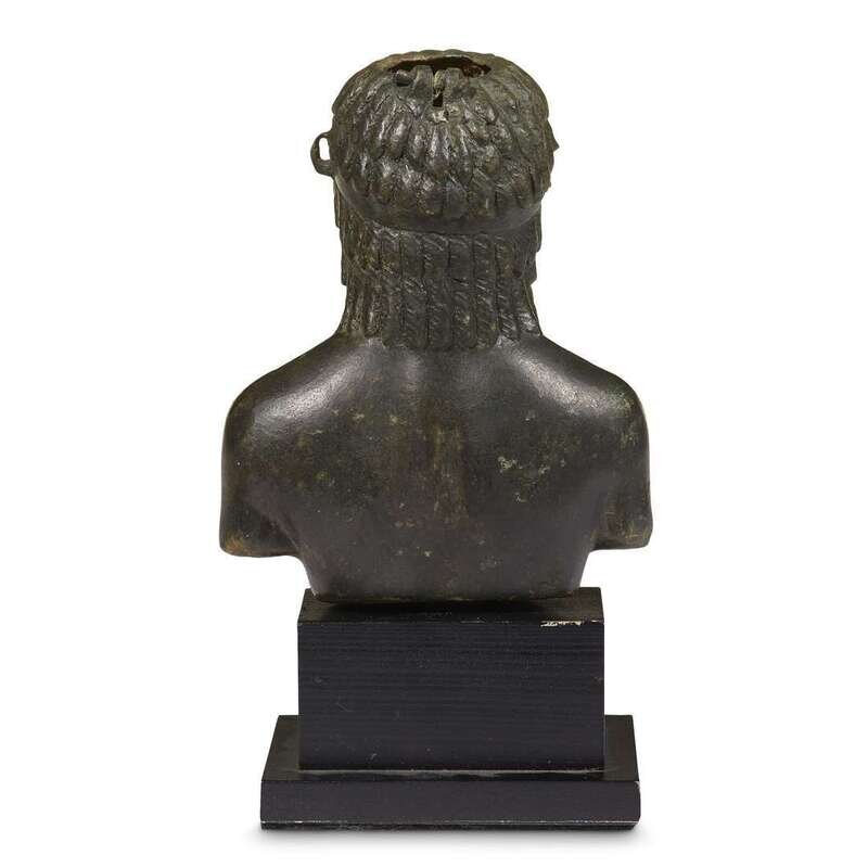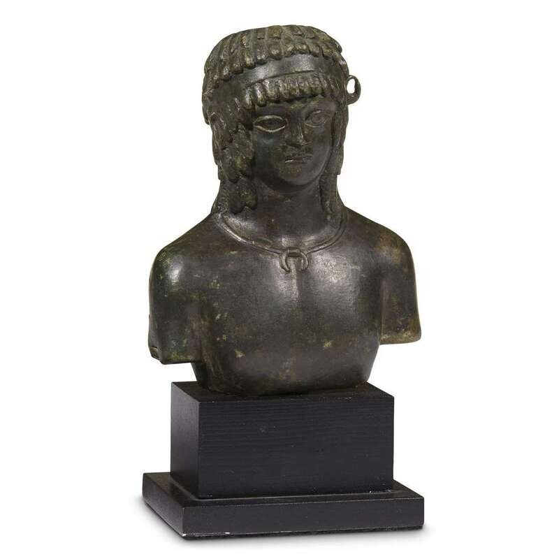 Cast bronze, the young deified companion of Hadrian is depicted with a mass of corkscrew curls, he wears a necklace with crescent pendant and headband, raised on a wooden mount.