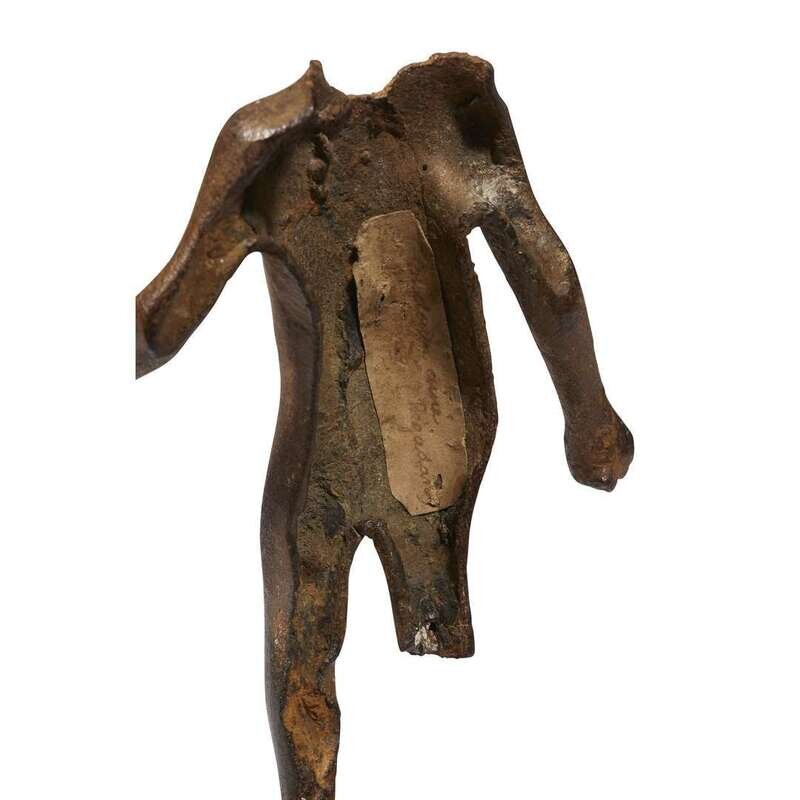 Cast bronze, shown nude, standing with the arms helds away from the sides, the back is recessed, suggesting the piece may have been a decorative inlay, there is an old collection label (now largely illegible) with the date "1892" visible. Raised on an old marble mount.