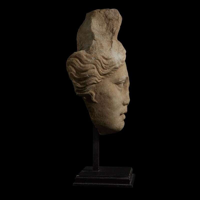 Carved marble, the goddess of fortune and destiny is shown with sensitively rendered features, her wavy hair swept below a fragmentary mural crown, raised on a bespoke mount.
