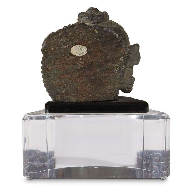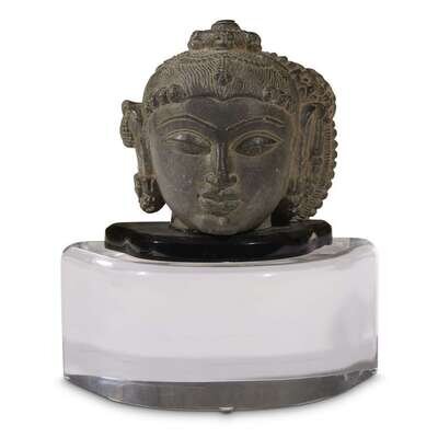 Carved black granite, shown with large, lidded eyes, wide brow and full lips, the hair decorated with beads and tied up into an ushnisha, the ears long and adorned with profuse earrings, raised on a perspex mount.