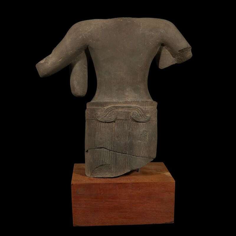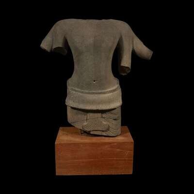 Grey sandstone, shown wearing a pleated sampot held in place with an ornate belt, the outline of the torso with an elegant curve. Raised on a wooden mount.