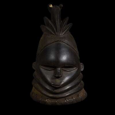 Carved wood and fibre, with a ringed neck, triangular face and elaborate coiffure.