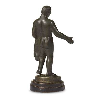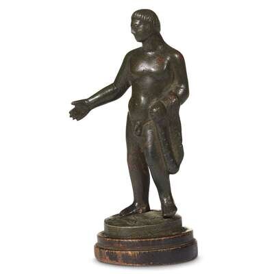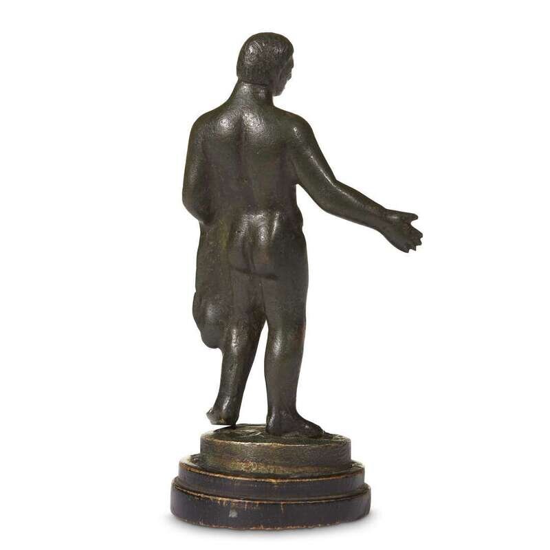 Cast bronze, shown nude, with a lionskin draped over his left forearm and holding a broad club, the right hand is outstretched, standing on a later bronze plinth atop a wooden base.