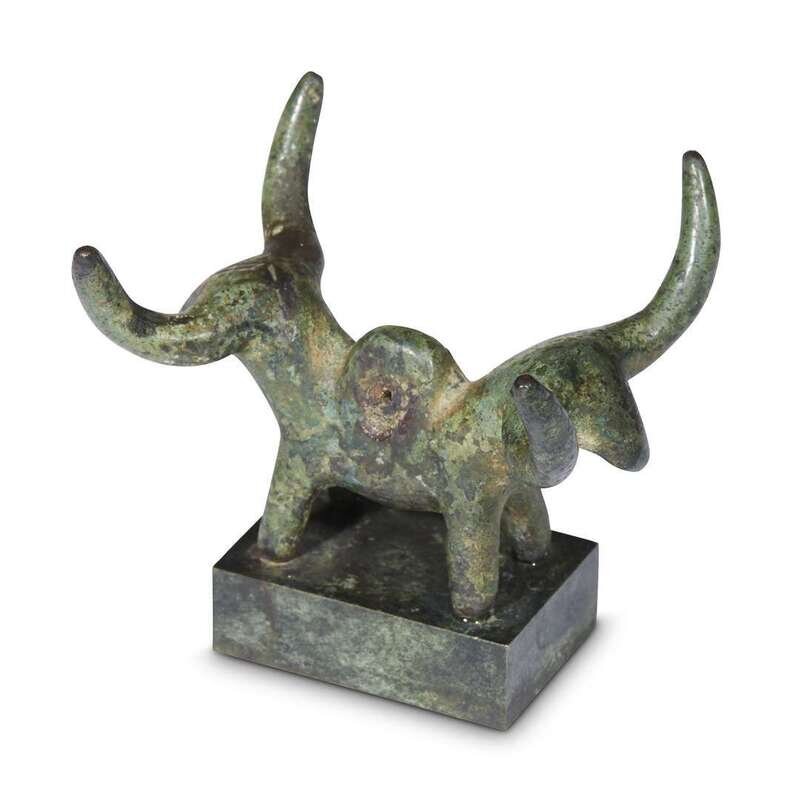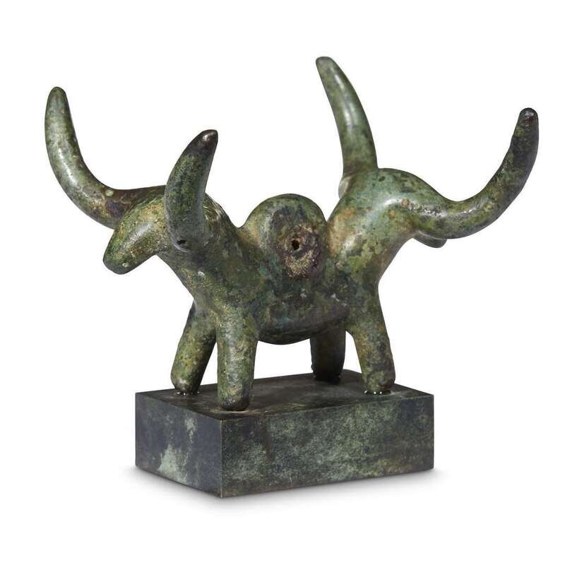 Cast bronze, in the form of opposing standing bulls with elaborately curving horns, the hump on the back with an incision for attachment, standing on a bespoke mount.