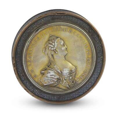 Circular, the cover set with a medal depicting Empress Catherine II Alexeievna "The Great" in profile, signed Timofei Ivanov, and with surrounding inscription in Cyrillic "B.M. Ekaterina II Imperat[ritsa] I samoderzh[itsa] Vseross[isskoi];" allover decorated in niello with geometric patterns, the interior silver gilt and struck with the Moscow mark for 1780.