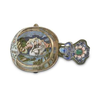 Of typical form, set with hardstone agates dyed green, blue, and rose color and allover cloisonné enameled centering a landscape with swans (enamel damaged); the base struck with the maker's mark and the left-facing kokoshnik mark for Moscow, 1896-1908, 84 zolotniki.