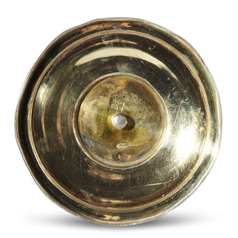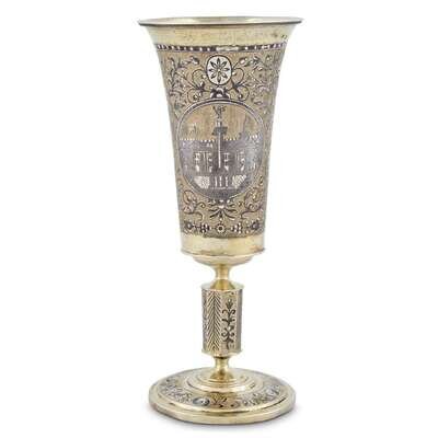 Of typical fluted form and turned base decorated with two cartouches, one depicting the Alexander Column and Palace Square, the other with Falconet's "Bronze Horseman," overall decorated with scrolling foliate motifs, the base struck with unknown maker's mark AK (cf. Postnikova-Losseva, Zolotoe i serebryanoe delo XV-XX vv., Moscow, 1995, No. 2199, p. 208), with Moscow assay master's mark of Nikolai Lukich Dubrovin and dated 1837.