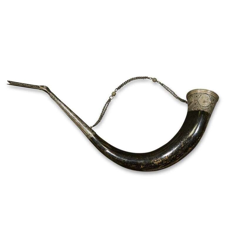 AN OTTOMAN SILVER NIELLO AND PARCEL-GILT POWDER HORN Caucasus, late 19th century