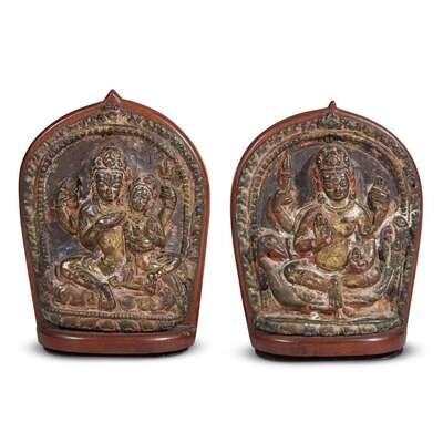 PAIR OF NEPALESE GILT BRASS REPOUSSÉ PLAQUES DEPICTING SHIVA WITH PARVATI (UMA-MAHESHVARA) AND KUMARA possibly 10th-12th century
