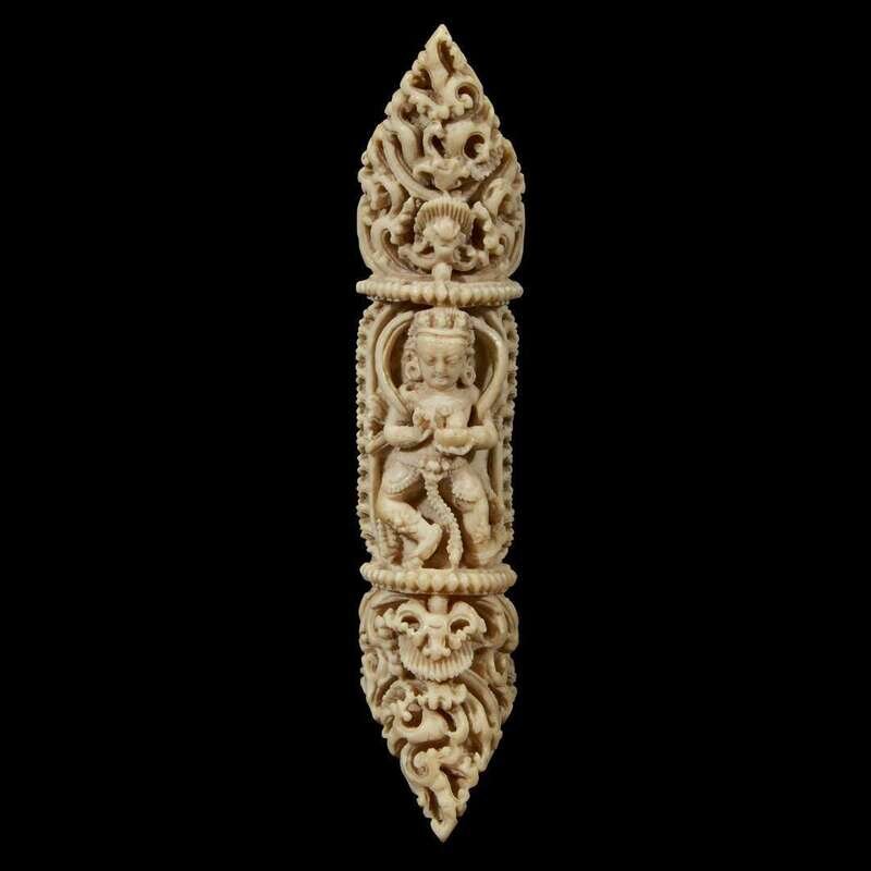 Finely carved, the center depicting a female bodhisattva holding a kapala.