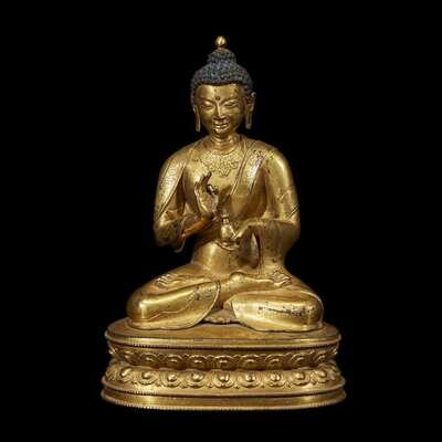 A FINELY CAST AND ENGRAVED SINO-TIBETAN GILT COPPER ALLOY FIGURE OF A SEATED BUDDHA 17th/18th century or earlier