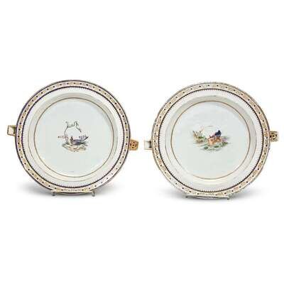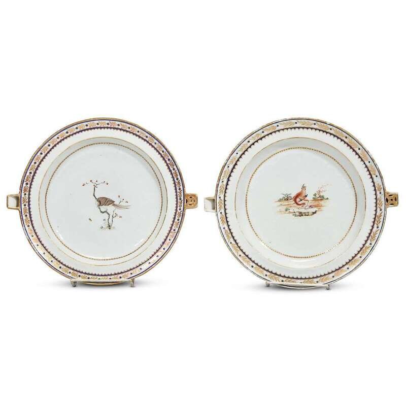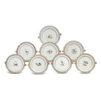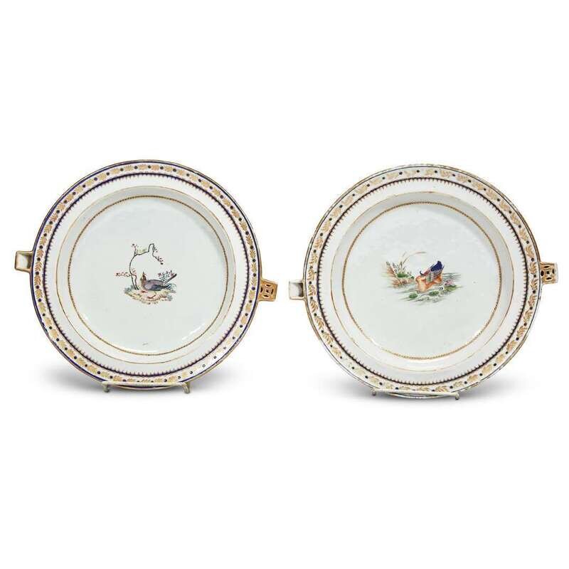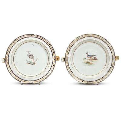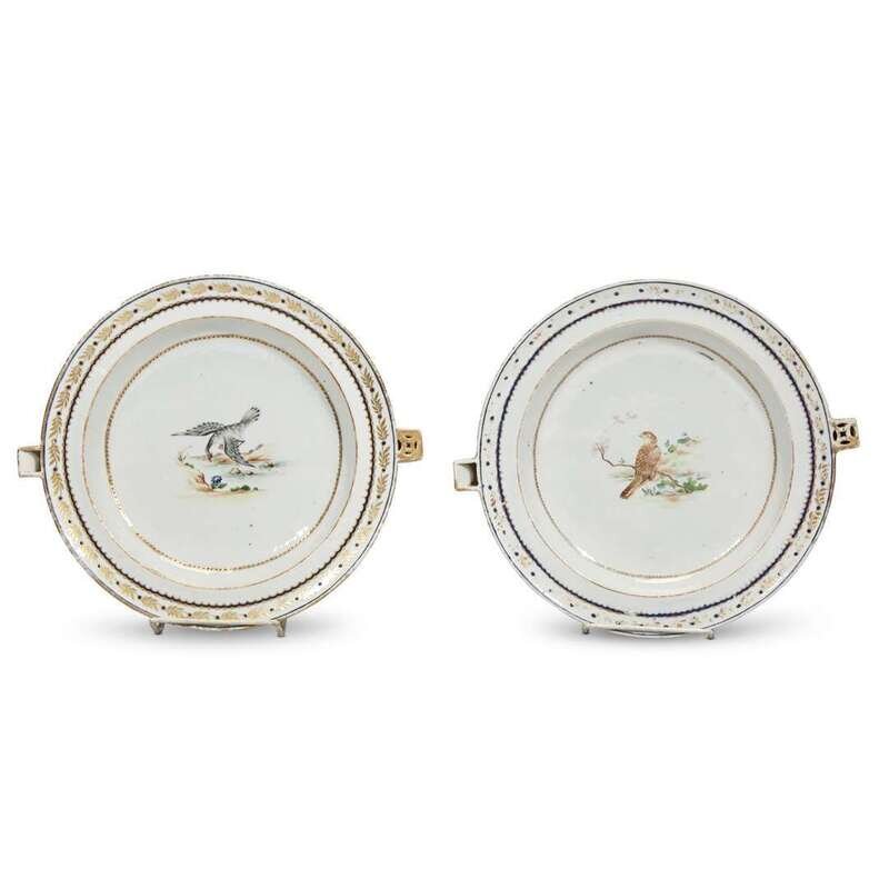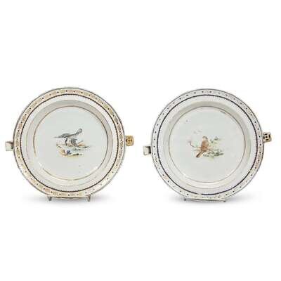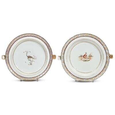 EIGHT CHINESE EXPORT PARCEL-GILT AND ENAMELED PORCELAIN WARMING DISHES WITH BIRDS late 18th/early 19th century