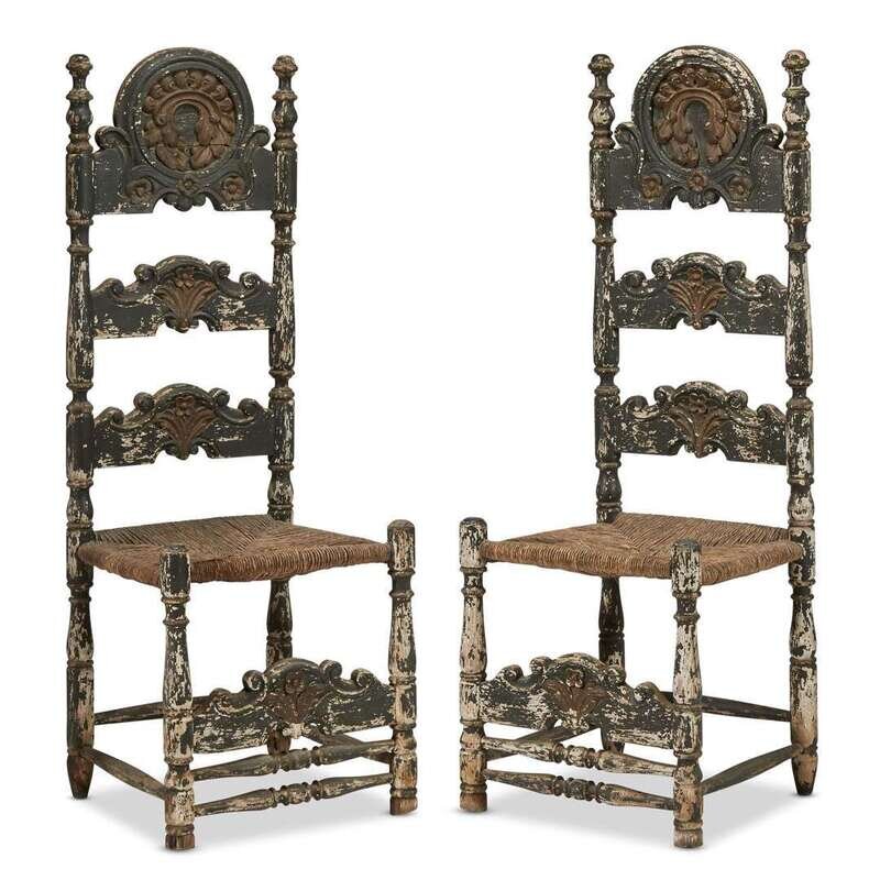 A PAIR OF SPANISH COLONIAL POLYCHROME PAINTED RUSH-SEAT LADDERBACK CHAIRS 19th century